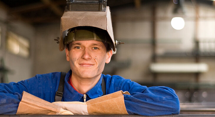 Ein junger Mann mit Schweißerhelm und Schweißerhandschuhen.