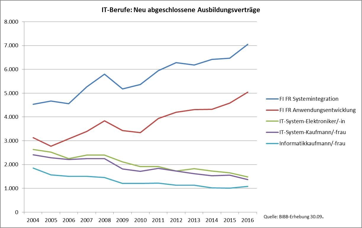 Der Ausbildungsberuf Fachinformatiker/-in mit seinen beiden Fachrichtungen hat sich in den letzten Jahren immer mehr zur nachgefragten Kernmarke der IT-Berufe entwickelt, die die tendenziell rückläufigen Zahlen in den drei anderen Berufen überkompensiert. Zwischen 2015 und 2016 sind die Zahlen der neu abgeschlossenen Ausbildungsverträge in diesem Beruf noch einmal um 1.000 auf über 12.000 gestiegen.