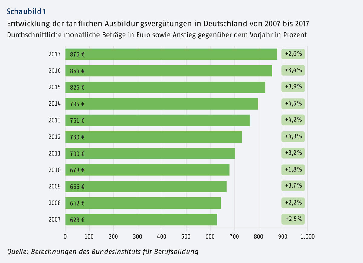 In den letzten Jahren wurde es für viele Betriebe immer schwieriger, ihre Ausbildungsstellen zu besetzen. Die Gründe hierfür lagen in den stark gesunkenen Schulabgängerzahlen aufgrund der demografischen Entwicklung, der verstärkten Neigung der Jugendlichen zu akademischer Bildung sowie den zunehmenden Passungsproblemen auf dem Ausbildungsmarkt. Infolgedessen wurden ab dem Jahr 2012 so starke Zuwächse bei den Vergütungen erreicht wie vorher lange Zeit nicht mehr. Vor diesem Hintergrund war allerdings die eher moderate Anhebung der Ausbildungsvergütungen 2017 überraschend.