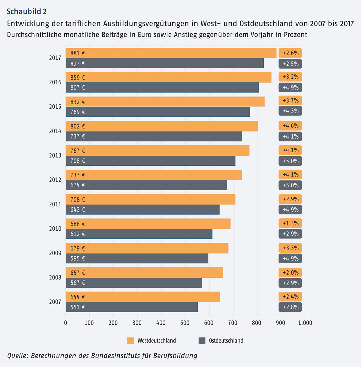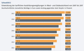 Die stärkeren Vergütungsanhebungen in Ostdeutschland waren insbesondere darauf zurückzuführen, dass es in vielen Branchen seit Langem Bestrebungen der Tarifpartner – insbesondere der Gewerkschaftsseite – gab, die Ausbildungsvergütungen in West und Ost mehr und mehr anzupassen bis zur vollständigen Angleichung. In einer Reihe von Branchen wurde dieses Ziel inzwischen schon erreicht. Ein weiterer Grund für höhere Vergütungssteigerungen in Ostdeutschland war, dass hier der Rückgang der Schulabgängerzahlen viel früher einsetzte als in Westdeutschland und dies für die ostdeutschen Betriebe bereits ab 2008 zu größeren Schwierigkeiten bei der Besetzung der Ausbildungsstellen führte. So kam es im Osten schon im Jahr 2009 zu einer Erhöhung der tariflichen Ausbildungsvergütungen um durchschnittlich 4,9 Prozent, und von 2011 bis 2016 lag der jährliche Vergütungsanstieg jeweils zwischen 4,1 Prozent (2014) und 5,0 Prozent (2012 und 2013). Demgegenüber fiel der Vergütungsanstieg 2017 mit 2,5 Prozent überraschend schwach aus, gegenüber dem Vorjahr halbierte sich die prozentuale Steigerungsrate