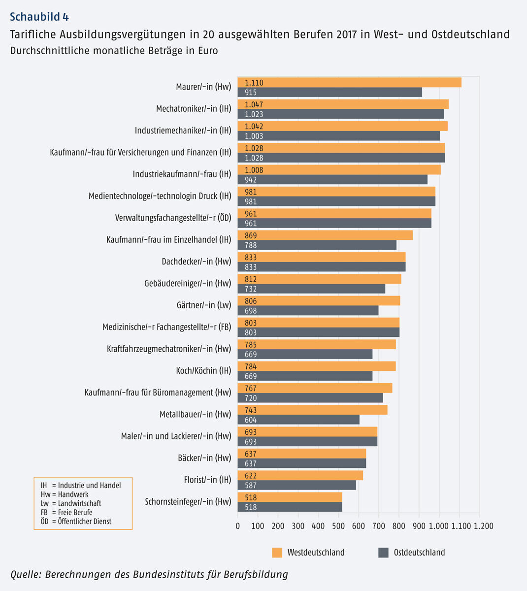 Daneben gab es aber auch eine Reihe von Berufen, in denen 2017 kein Ost-West-Unterschied der tariflichen Ausbildungsvergütungen mehr bestand. Hierzu zählten die Berufe „Kaufmann/-frau für Versicherungen und Finanzen“, „Medientechnologe/-technologin Druck“, „Verwaltungsfachangestellte/-r“, „Dachdecker/-in“, „Medizinische/-r Fachangestellte/-r“, „Maler/-in und Lackierer/-in“, „Bäcker/-in“ und „Schornsteinfeger/-in“.