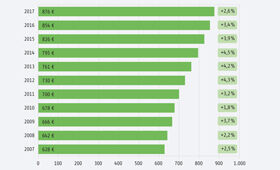 Wie die neueste Auswertung tariflicher Ausbildungsvergütungen des Bundesinstituts für Berufsbildung (BIBB) ergeben hat, lagen die Vergütungen 2017 in Deutschland im Gesamtdurchschnitt bei 876 € pro Monat. Sie erhöhten sich um durchschnittlich 2,6 Prozent gegenüber dem Vorjahr und damit deutlich schwächer als 2016 (3,4 Prozent). In Westdeutschland betrugen die tariflichen Vergütungen 2017 durchschnittlich 881 €, in Ostdeutschland 827 €. Der prozentuale Vergütungsanstieg unterschied sich zwischen West- und Ostdeutschland mit 2,6 Prozent bzw. 2,5 Prozent kaum. Der Abstand zwischen west- und ostdeutschem Tarifniveau hat sich somit nicht verändert: 2017 wurden im Osten ebenso wie im Jahr zuvor 94 Prozent der westlichen Vergütungshöhe erreicht.