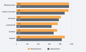 Die berufsspezifischen Vergütungsdurchschnitte fielen 2017 in Ostdeutschland häufig deutlich