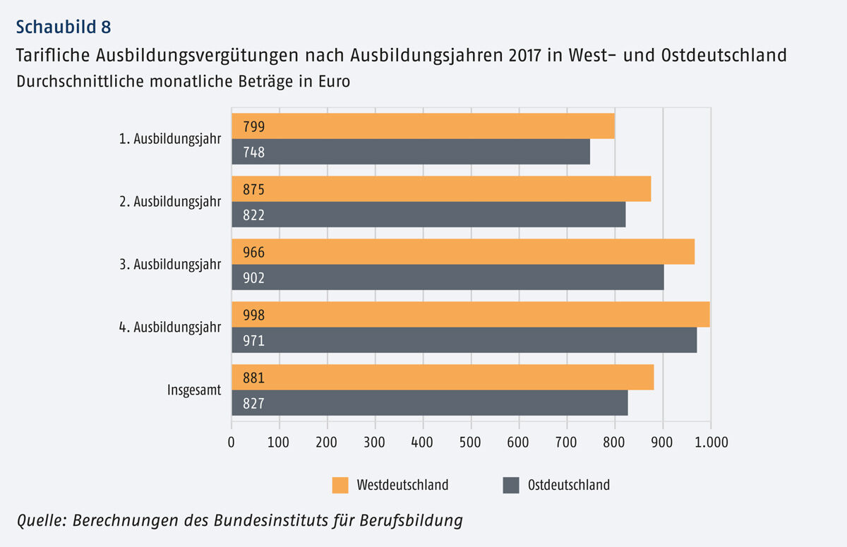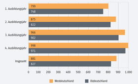Die für das gesamte Bundesgebiet ermittelten Vergütungsdurchschnitte wurden sehr stark vom westlichen Vergütungsniveau geprägt, da der weitaus größte Teil der Auszubildenden in Westdeutschland ausgebildet wurde. Daher wird im Text hier und im Folgenden auf die westdeutschen Ergebnisse nicht gesondert eingegangen.