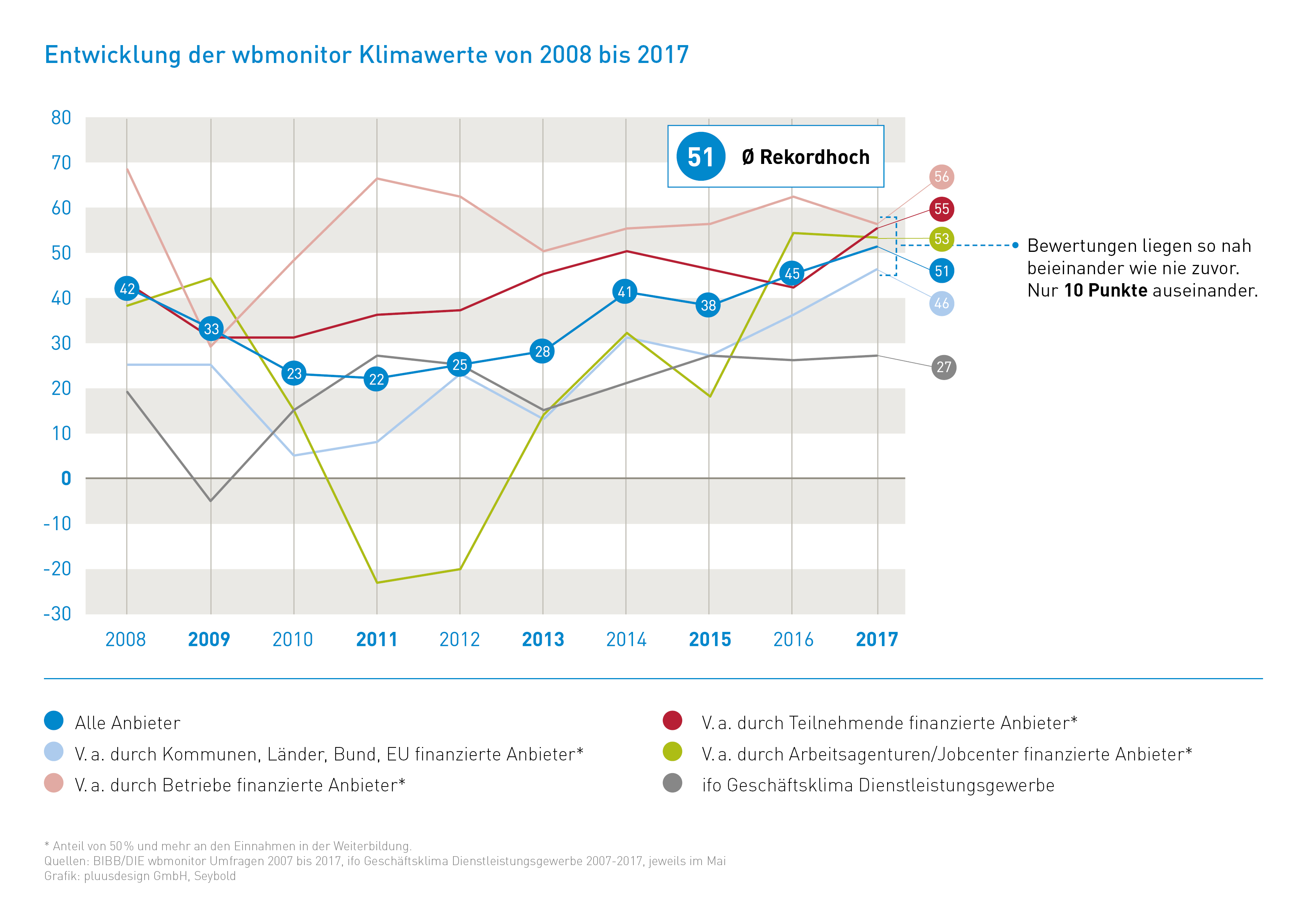 Wie jedes Jahr ermittelte wbmonitor die wirtschaftliche Stimmungslage in der Weiterbildung. Im Mai 2017 erreichte der wbmonitor Klimawert ein neues Allzeithoch. In allen untersuchten Teilsegmenten war das Wirtschaftsklima ausgesprochen gut – noch nie lagen die jeweiligen Werte so dicht beieinander. Während sich bei den überwiegend privat (d.h. durch Teilnehmende/Selbstzahler und/oder Betriebe) finanzierten Anbietern die gute Konjunkturlage spiegeln dürfte, kommen den vor allem öffentlich finanzierten Einrichtungen (mit Mitteln von Kommunen, Ländern, Bund, EU bzw. der Arbeitsagenturen/Jobcenter) offensichtlich nach wie vor die Investitionen in die Qualifizierung Geflüchteter zugute.