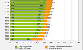 Aufgrund der wirtschaftlichen Umstrukturierungen kam es im Osten schon bald nach der deutschen Vereinigung zu beträchtlichen Schwierigkeiten auf dem Ausbildungsmarkt. Die ursprünglich vor allem in Großbetrieben konzentrierten Ausbildungskapazitäten gingen zu einem großen Teil verloren. Verschärft wurden die Probleme durch eine starke Zunahme der Nachfrage nach Ausbildungsstellen aufgrund der demografischen Entwicklung in Ostdeutschland. Obwohl eine große Zahl an öffentlich finanzierten außerbetrieblichen Ausbildungsplätzen bereitgestellt und die Schaffung zusätzlicher betrieblicher Ausbildungsstellen durch umfangreiche Förderprogramme unterstützt wurde, sank die Angebots-Nachfrage-Relation im Osten immer weiter. Die Tarifpartner verständigten sich nun darauf, die Ausbildungsvergütungen, wenn überhaupt, nur noch wenig anzuheben, um die zusätzliche Kostenbelastung für die Ausbildungsbetriebe möglichst gering zu halten. Vereinzelt gab es auch Vergütungssenkungen, vor allem im Bauhauptgewerbe, in dem in Ostdeutschland besonders viele Jugendliche ausgebildet wurden. Der Gesamtdurchschnitt der tariflichen Ausbildungsvergütungen reduzierte sich daher 1997 sogar um 1,7 Prozent und 1999 um 0,7 Prozent. Anschließend lag die jährliche Vergütungssteigerung im Osten bis 2006 fast immer unter 2,0 Prozent. Die Angleichung der Vergütungen an das Westniveau war ab 1997 wieder rückläufig und fiel bis 2003 auf 84 Prozent zurück.