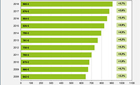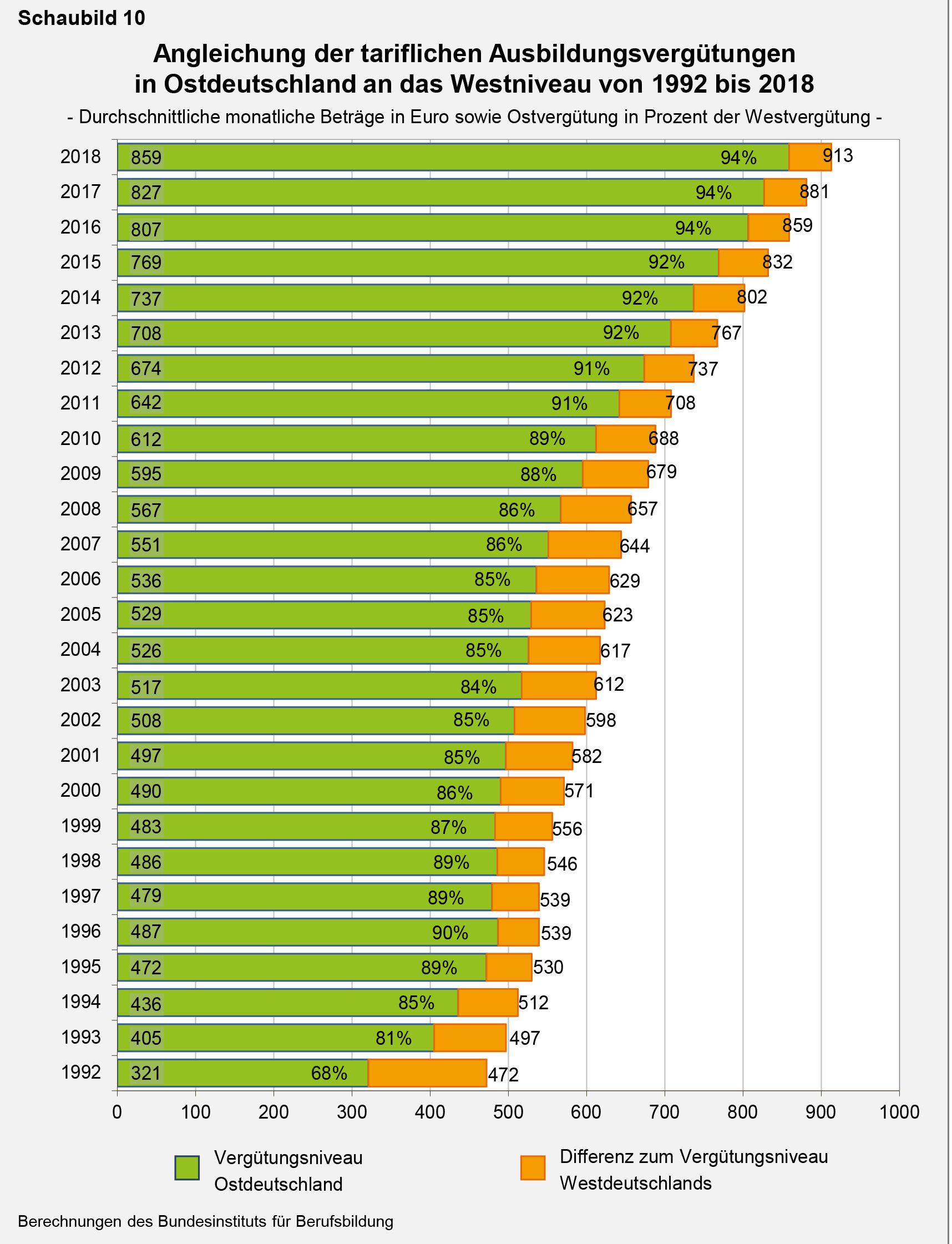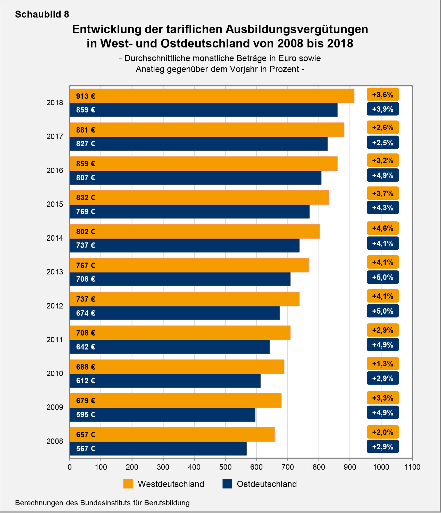 In Deutschland betrugen die tariflichen Ausbildungsvergütungen 2018 im Gesamtdurchschnitt 908 € pro Monat. Gegenüber dem Vorjahr erhöhten sie sich um durchschnittlich 3,7 Prozent und damit deutlich stärker als 2017 (2,6 %). In Westdeutschland lagen die tariflichen Vergütungen 2018 bei durchschnittlich 913 €, in Ostdeutschland bei 859 €. Der prozentuale Vergütungsanstieg fiel in Westdeutschland mit 3,6 Prozent nicht ganz so stark aus wie in Ostdeutschland mit 3,9 Prozent. Der Abstand zwischen west- und ostdeutschem Tarifniveau blieb unverändert bestehen: 2018 wurden im Osten ebenso wie im Jahr zuvor 94 Prozent der westlichen Vergütungshöhe erreicht. Dies sind die zentralen Ergebnisse der neuesten Auswertung tariflicher Ausbildungsvergütungen des Bundesinstituts für Berufsbildung (BIBB).