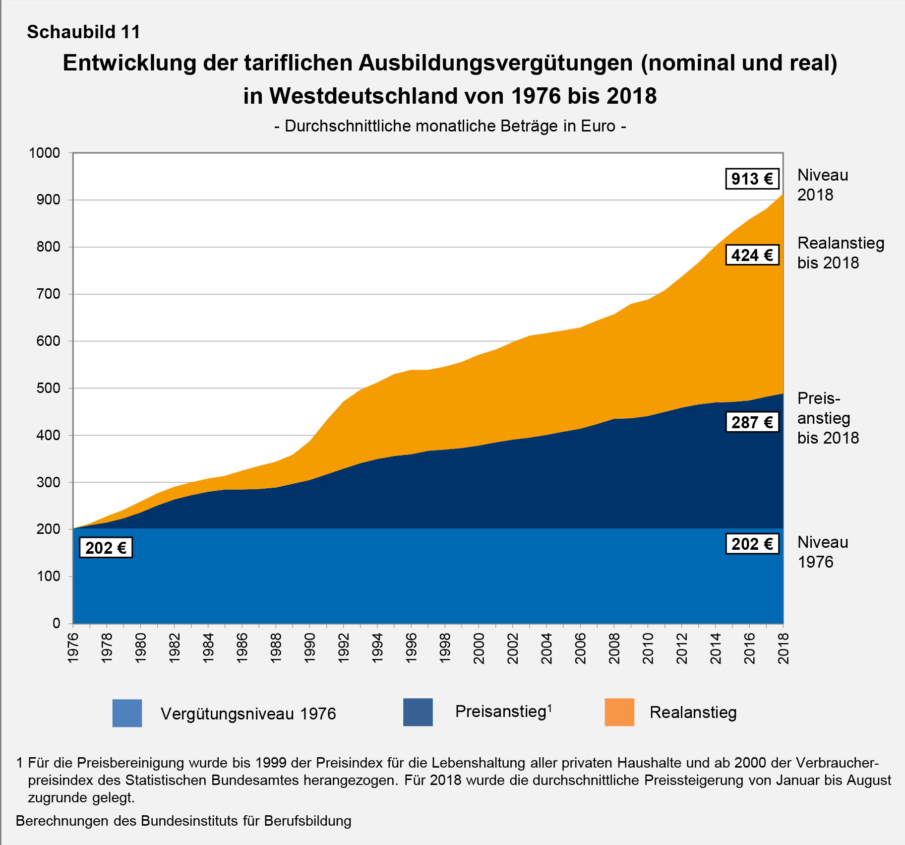 Die Lebenshaltung verteuerte sich im Westen von 1976 bis 2018 um insgesamt 142 Prozent. In absoluten Beträgen ausgedrückt bedeutet dies, dass von der durchschnittlichen Vergütungszunahme um 711 € durch den Kaufkraftverlust 287 € wieder aufgezehrt wurden und 424 € als reale Erhöhung der monatlichen Ausbildungsvergütungen verblieben. Um die gleiche Kaufkraft wie 1976 zu erzielen, mussten die Vergütungen 2018 bei 489 € liegen. Real haben sich die tariflichen Vergütungen in Westdeutschland 2018 mit 913 € seit 1976 somit um 87 Prozent erhöht.