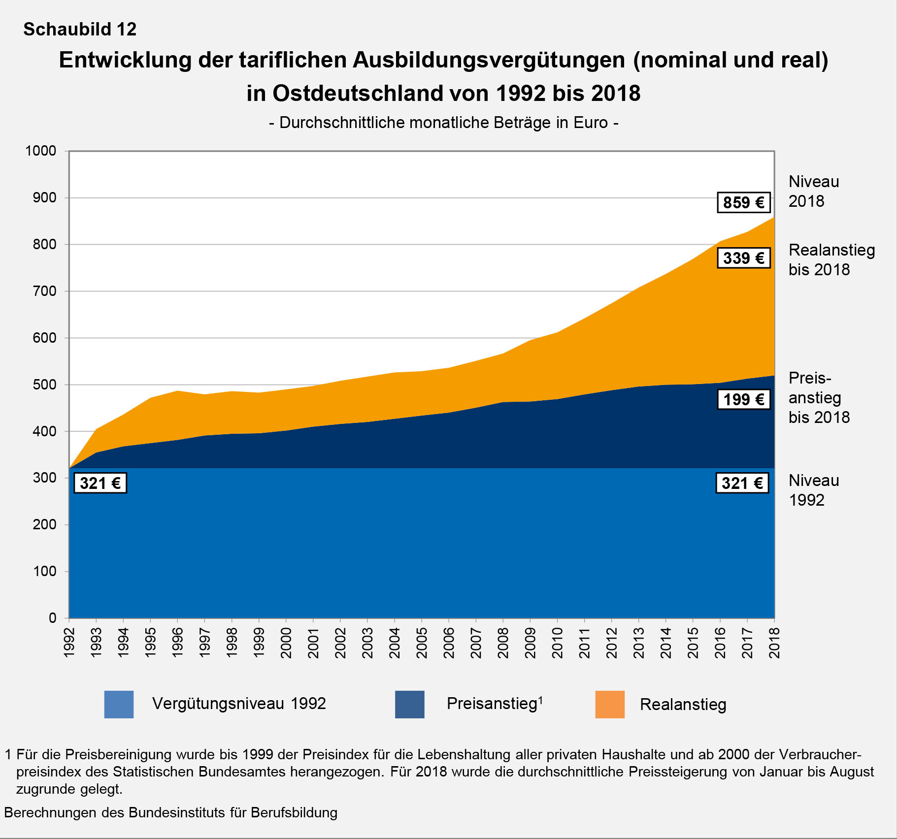Die tariflichen Ausbildungsvergütungen in Ostdeutschland betrugen im Jahr 1992 durchschnittlich 321 € pro Monat. Bis 2018 erhöhten sie sich auf 859 €, also nominal um insgesamt 168 Prozent. Wie aus Schaubild 12 hervorgeht, fiel die reale Vergütungssteigerung jedoch deutlich geringer aus. Der Preisanstieg für die Lebenshaltung betrug von 1992 bis 2018 insgesamt 62 Prozent. Von der Gesamtzunahme in Höhe von durchschnittlich 538 € wurden somit 199 € durch den Kaufkraftverlust wieder aufgezehrt, und 339 € blieben als realer Zuwachs übrig. Damit haben sich die tariflichen Ausbildungsvergütungen in Ostdeutschland seit 1992 real um 65 Prozent erhöht.