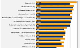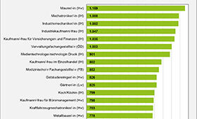 Besonders hoch war demnach das Vergütungsniveau im Handwerksberuf "Maurer/-in" mit einem Gesamtdurchschnitt von 1.159 € im Monat. Hohe Vergütungen wurden beispielsweise auch in den Berufen "Mechatroniker/-in", "Industriemechaniker/-in", "Industriekaufmann/-frau" sowie "Kaufmann/-frau für Versicherungen und Finanzen" erreicht. Eher niedrige Beträge wiesen zum Beispiel die Berufe "Schornsteinfeger/-in", "Friseur/-in", "Florist/-in" und "Bäcker/-in" auf.