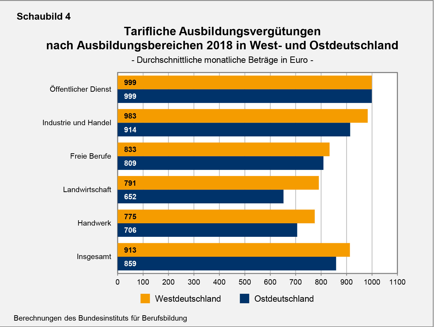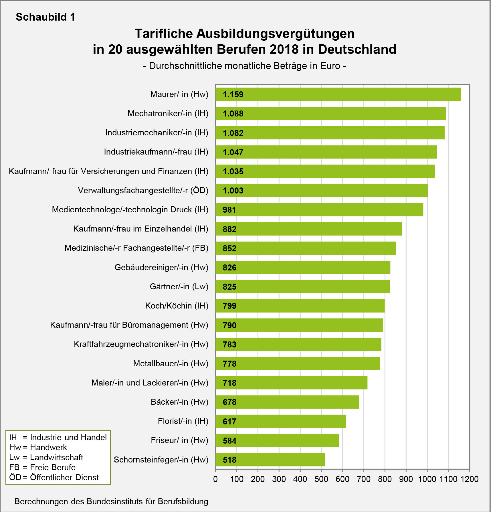 Bei den Ergebnissen ist zu beachten, dass sich die tariflichen Ausbildungsvergütungen selbst im gleichen Beruf teilweise erheblich zwischen den Branchen und den Regionen (auch innerhalb von West- bzw. Ostdeutschland) unterscheiden. Im individuellen Fall kann die Vergütung daher deutlich höher oder niedriger ausfallen als der ermittelte berufsspezifische Durchschnittswert. Zudem ist zu berücksichtigen, dass die tariflichen Ausbildungsvergütungen nur in der betrieblichen Berufsausbildung gelten. In der aus öffentlichen Mitteln finanzierten außerbetrieblichen Ausbildung erhalten die Auszubildenden in der Regel wesentlich niedrigere Vergütungsbeträge. Diese sind durch Gesetz oder Verordnung festgelegt und werden deshalb in die Auswertung der tariflichen Ausbildungsvergütungen nicht einbezogen.