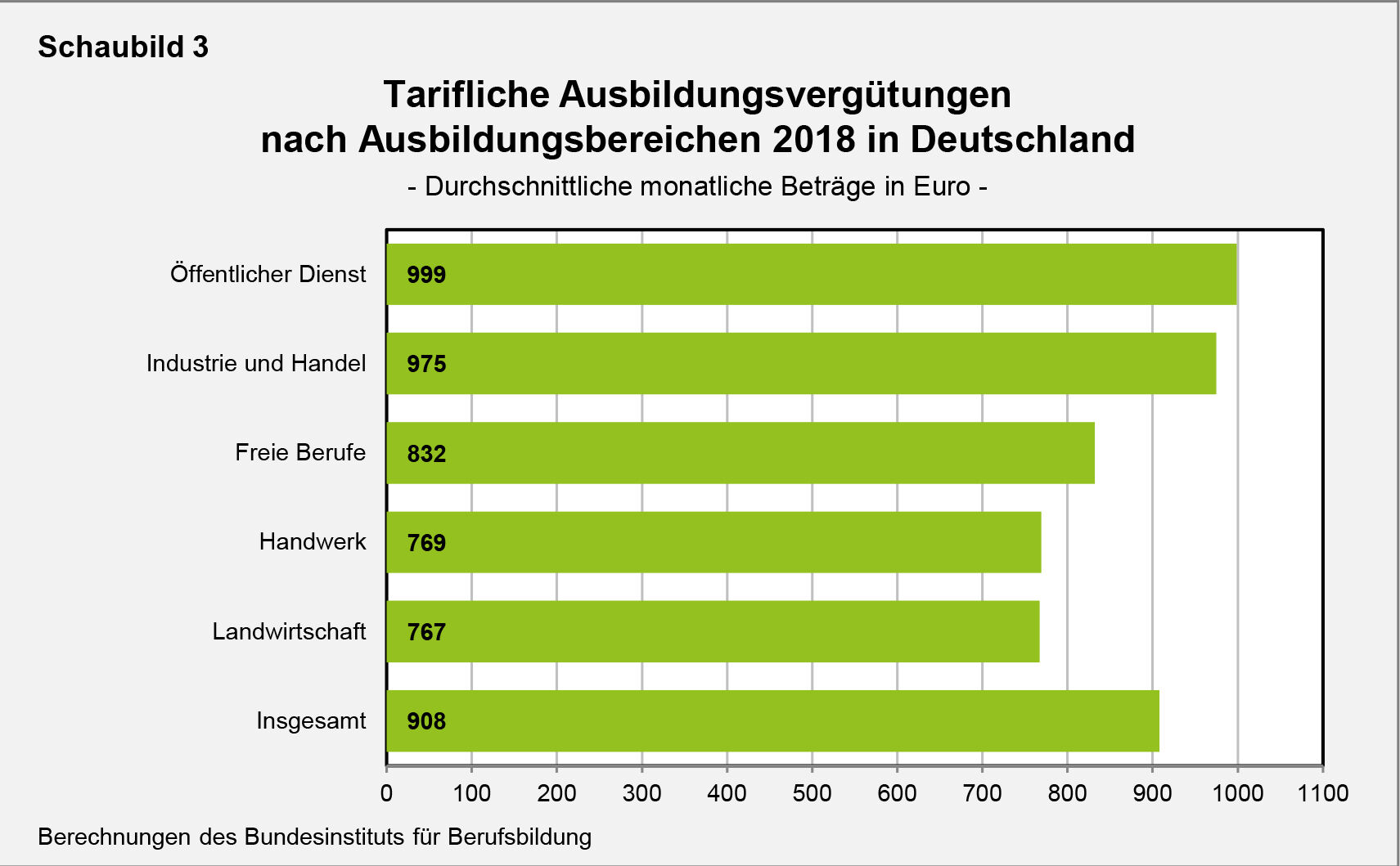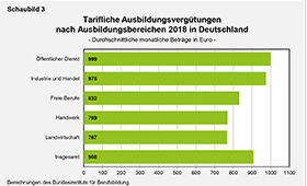 Zwischen den Ausbildungsbereichen unterschied sich das Vergütungsniveau 2018 in Deutschland relativ stark, wie Schaubild 3 zeigt. Im Öffentlichen Dienst waren demnach im Durchschnitt die höchsten tariflichen Ausbildungsvergütungen vereinbart. Fast ebenso hoch lag der Vergütungsdurchschnitt in Industrie und Handel. Deutlich niedriger fielen dagegen die Durchschnittsbeträge in der Landwirtschaft, im Handwerk und bei den Freien Berufen aus.