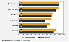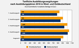 Die Höhe der tariflich vereinbarten Vergütungen variiert von Branche zu Branche beträchtlich. Zudem gibt es innerhalb vieler Branchen regional abweichende tarifliche Regelungen. Somit bestehen Unterschiede in der Höhe der Ausbildungsvergütungen sowohl zwischen den Branchen als auch zwischen den Regionen, und zwar insbesondere zwischen West- und Ostdeutschland.