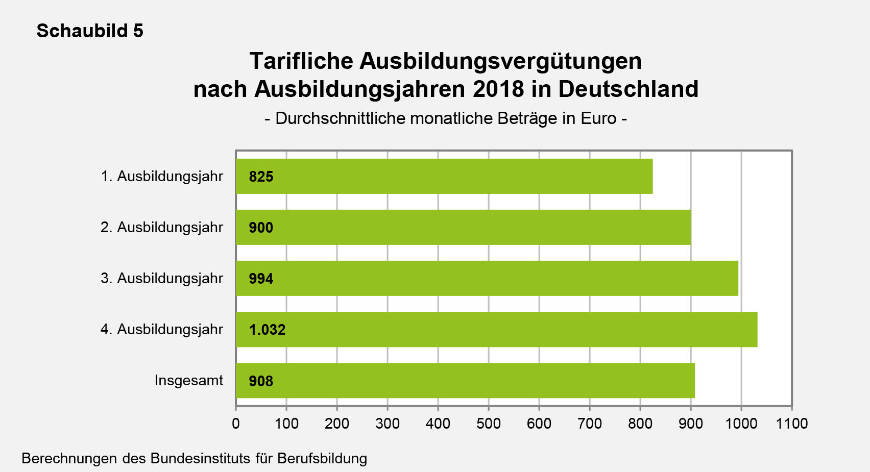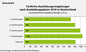 Bei allen bisher genannten Beträgen handelte es sich jeweils um die durchschnittlichen tariflichen Vergütungen während der gesamten in der Ausbildungsordnung festgelegten Ausbildungsdauer der Berufe. Dem Schaubild 5 sind die 2018 für die einzelnen Ausbildungsjahre ermittelten Durchschnittswerte bezogen auf das gesamte Bundesgebiet zu entnehmen.