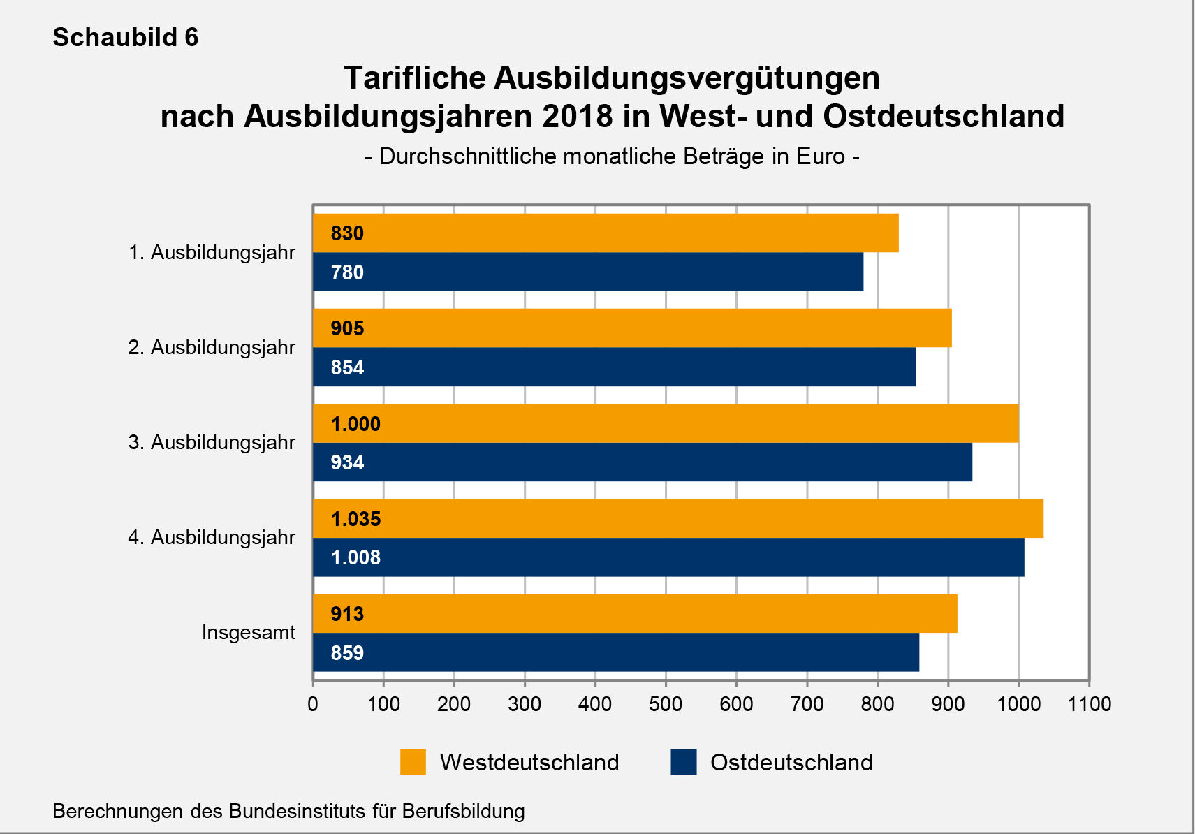 Auf Grundlage der ermittelten berufsspezifischen Vergütungsdurchschnitte in West- bzw. Ostdeutschland werden weitere Durchschnittswerte gebildet, z. B. für die verschiedenen Ausbildungsbereiche sowie ein Gesamtdurchschnitt über alle jeweils einbezogenen Berufe in West und Ost. Die Berufe gehen dabei mit dem Gewicht ihrer jeweiligen Auszubildendenzahlen in die Berechnung ein. Darüber hinaus werden auch jeweils durchschnittliche Vergütungsbeträge bezogen auf das gesamte Bundesgebiet berechnet. Hierbei erfolgt eine Gewichtung mit den west- und ostdeutschen Auszubildendenzahlen der jeweiligen Berufe. Da der weitaus größte Teil der Auszubildenden in Westdeutschland ausgebildet wird, sind die für das gesamte Bundesgebiet ermittelten Vergütungsdurchschnitte sehr stark vom westlichen Vergütungsniveau geprägt.