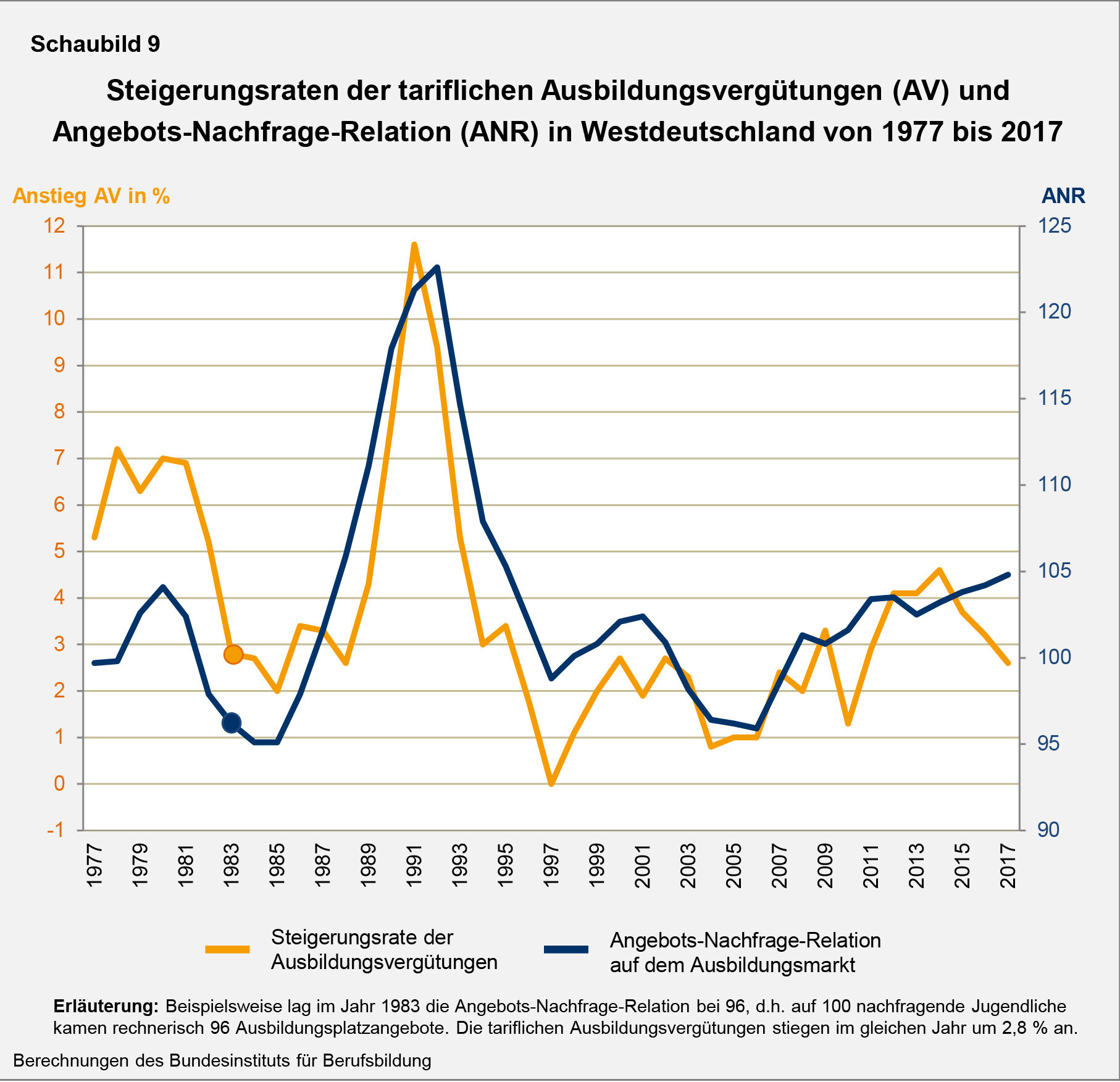 Wie die langfristige Beobachtung der Vergütungsentwicklung in Westdeutschland seit dem Jahr 1976 gezeigt hat, wirkte sich die Angebots-Nachfrage-Situation auf dem Ausbildungsmarkt in der Vergangenheit meistens deutlich auf die jährliche Anhebung der tariflichen Ausbildungsvergütungen aus (vgl. hierzu auch Beicht 2011). In Phasen, in denen die angebotenen betrieblichen Ausbildungsstellen vor allem wegen sehr hoher Schulabgängerzahlen bei Weitem nicht ausreichten, um die Nachfrage zu decken, fielen die Vergütungssteigerungen in der Regel sehr gering aus. An die Betriebe wurde dann appelliert, mehr Ausbildungsplätze für die unversorgten Jugendlichen zur Verfügung zu stellen, und viele Betriebe waren hierzu auch bereit. Mit sehr moderaten Anhebungen der Ausbildungsvergütungen versuchten die Tarifpartner in solchen Zeiten, einer zu starken Kostenbelastung der Ausbildungsbetriebe entgegenzuwirken. Hingegen wurde in Phasen, in denen die Betriebe aufgrund einer schwächeren Nachfrage Schwierigkeiten bei der Besetzung ihrer Ausbildungsplätze hatten, mit deutlichen Vergütungserhöhungen reagiert. Die Tarifpartner versprachen sich von einem solchen finanziellen Anreiz, mehr Jugendliche für eine duale Ausbildung zu gewinnen.