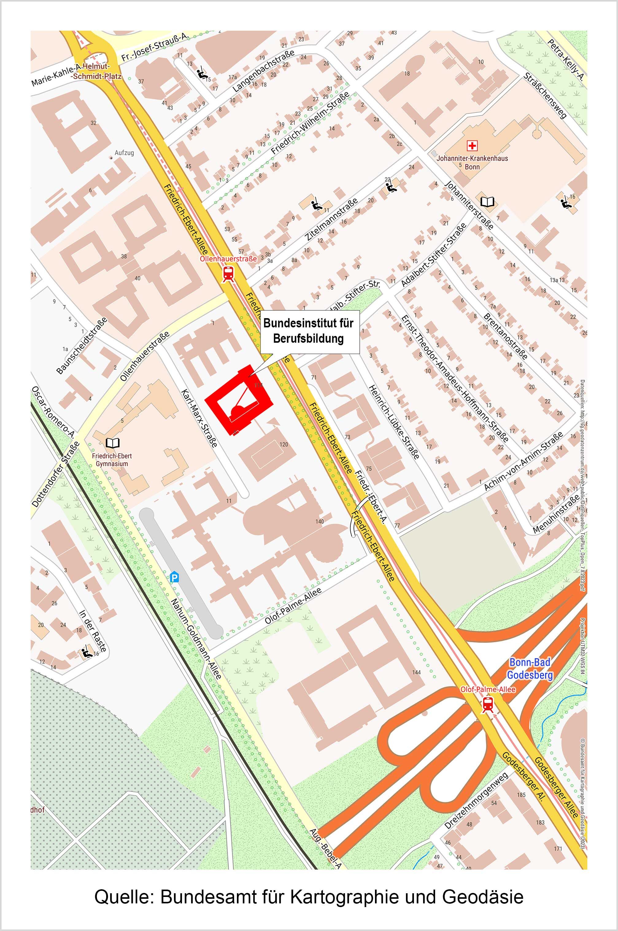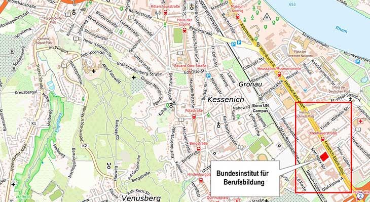 Das BIBB liegt an der Friedrich-Ebert-Allee (B9), etwa 150 m von der Stadtbahn-Haltestelle Ollenhauerstraße entfernt auf der rechten Straßenseite (in Richtung Bad Godesberg blickend).