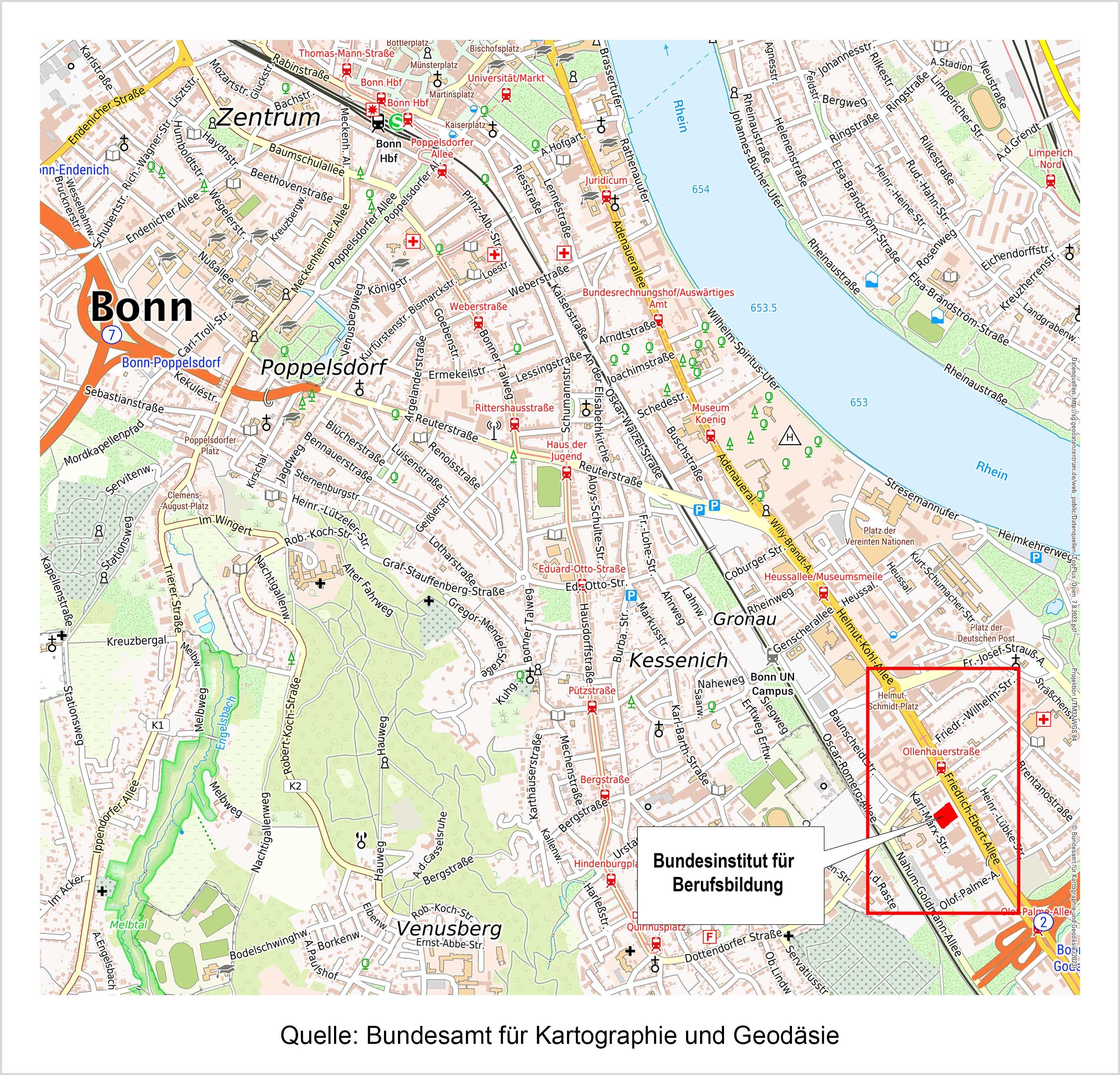 Aus Richtung Köln kommend bis Autobahnkreuz Bonn-Ost, dann auf die A562 und diese bis zum Ende durchfahren. Rechts auf die Nahum-Goldmann-Straße abbiegen, dann an der zweiten Möglichkeit rechts auf die Ollenhauerstraße fahren. An der zweiten Möglichkeit rechts auf die Friedrich-Ebert-Allee (B9) abbiegen, das BIBB befindet sich auf der rechten Straßenseite.