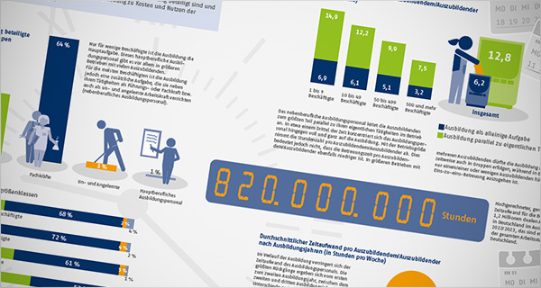 In der dualen Ausbildung investiert das betriebliche Ausbildungspersonal viel Zeit für die Vermittlung von Fähigkeiten und Fertigkeiten. Fast ausschließlich sind dabei Beschäftigte involviert, die die Ausbildungsleistungen während oder anstelle ihrer eigentlichen Tätigkeit erbringen. Das Poster zeigt, welche Beschäftigtengruppen an der betrieblichen Ausbildung beteiligt sind und wieviel Zeit sie aufwenden.