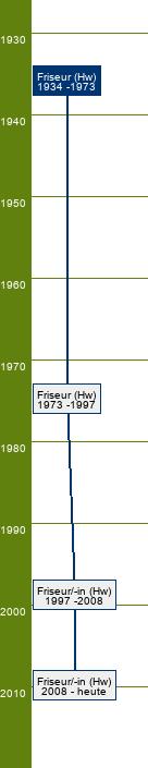 | 09.08.1961 | Erlass neuer Fachlicher Vorschriften für die Meisterprüfung im Friseur-Handwerk durch BMWi vom 19.12.1960 - II A 1 - 4593/60 und vom 09.08.1961 - II A 1 – 80 18 74; vom 09.08.1961 (BGBl. I S. II A 1 - 80 18 74) |
