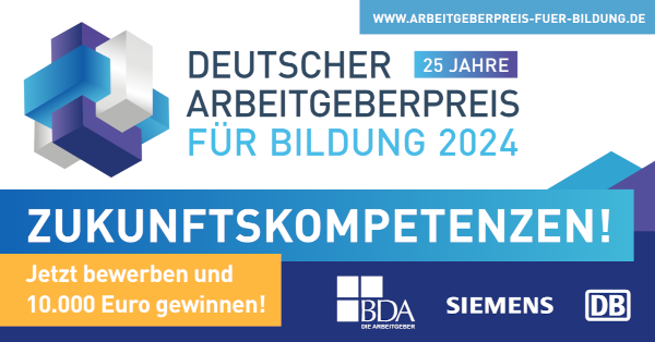 Die Ausschreibung zum Deutschen Arbeitgeberpreis für Bildung 2024 ist gestartet. Der Preis steht in diesem Jahr unter dem Motto „Zukunftskompetenzen“. Gesucht werden gute Lehr- und Lernkonzepte, die gezielt Werte und Fähigkeiten für die Welt von morgen fördern. Kitas, Schulen, Berufsschulen und Hochschulen können sich noch bis zum 10. Juli in einer von vier Kategorien bewerben und jeweils 10.000 Euro gewinnen.