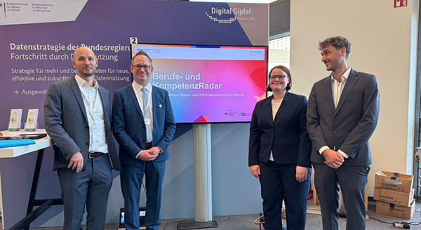 „Deutschland Digital – Innovativ. Souverän. International“ – unter diesem Motto fand am 21. und 22. Oktober der Digital-Gipfel der Bundesregierung statt. Mehr als 1.500 Teilnehmerinnen und Teilnehmer aus Politik, Wissenschaft, Wirtschaft und Zivilgesellschaft kamen in Frankfurt am Main zusammen, um über Fragen, Herausforderungen und Lösungsvorschläge der digitalen Transformation zu diskutieren. Mit dem „Berufe- und KompetenzRadar“ entwickelte das BIBB ein interaktives Webportal, das Entscheidungsträger/innen in Politik, Wirtschaft und Ausbildungspraxis, der Wissenschaft sowie der interessierten Öffentlichkeit verlässliche Informationen zur beruflichen Bildung und zur Arbeitsmarktentwicklung visuell verständlich zur Verfügung stellt. Die interessierten Besucher/-innen konnten den Prototyp dieses neuen Daten- und Informationsportals kennen lernen.