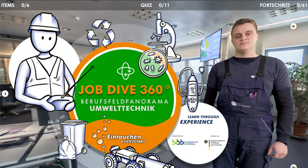Das neue Panorama der BIBB-Fachstelle überaus zu den umwelttechnischen Berufen aus der Reihe "Job Dive 360°" widmet sich zentralen Ausbildungsberufen unserer Versorgungs- und Entsorgungsinfrastruktur. Auf zynd.de, dem BIBB-Portal für Berufsorientierung und Übergangsgestaltung, können Jugendliche in die vielfältige Arbeitswelt von Umwelttechnologen und Umwelttechnologinnen eintauchen, Erfahrungen von Auszubildenden hautnah miterleben, Videos, Interviews, Fotostrecken, fachliche Wissenshappen konsumieren oder kurze Quizaufgaben lösen.