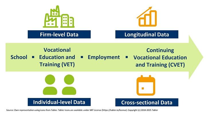 The Research Data Centre of the Federal Institute for Vocational Education and Training (BIBB-FDZ) processes the microdata from BIBB research projects and makes them available for non-commercial research. The BIBB-FDZ is accredited by the German Data Forum (RatSWD). The BIBB-FDZ structures its data along an ideal-typical life course, ranging from school to vocational training, employment, and continuing education. The data can be categorised by phase of the life course, data collection unit, and survey design.